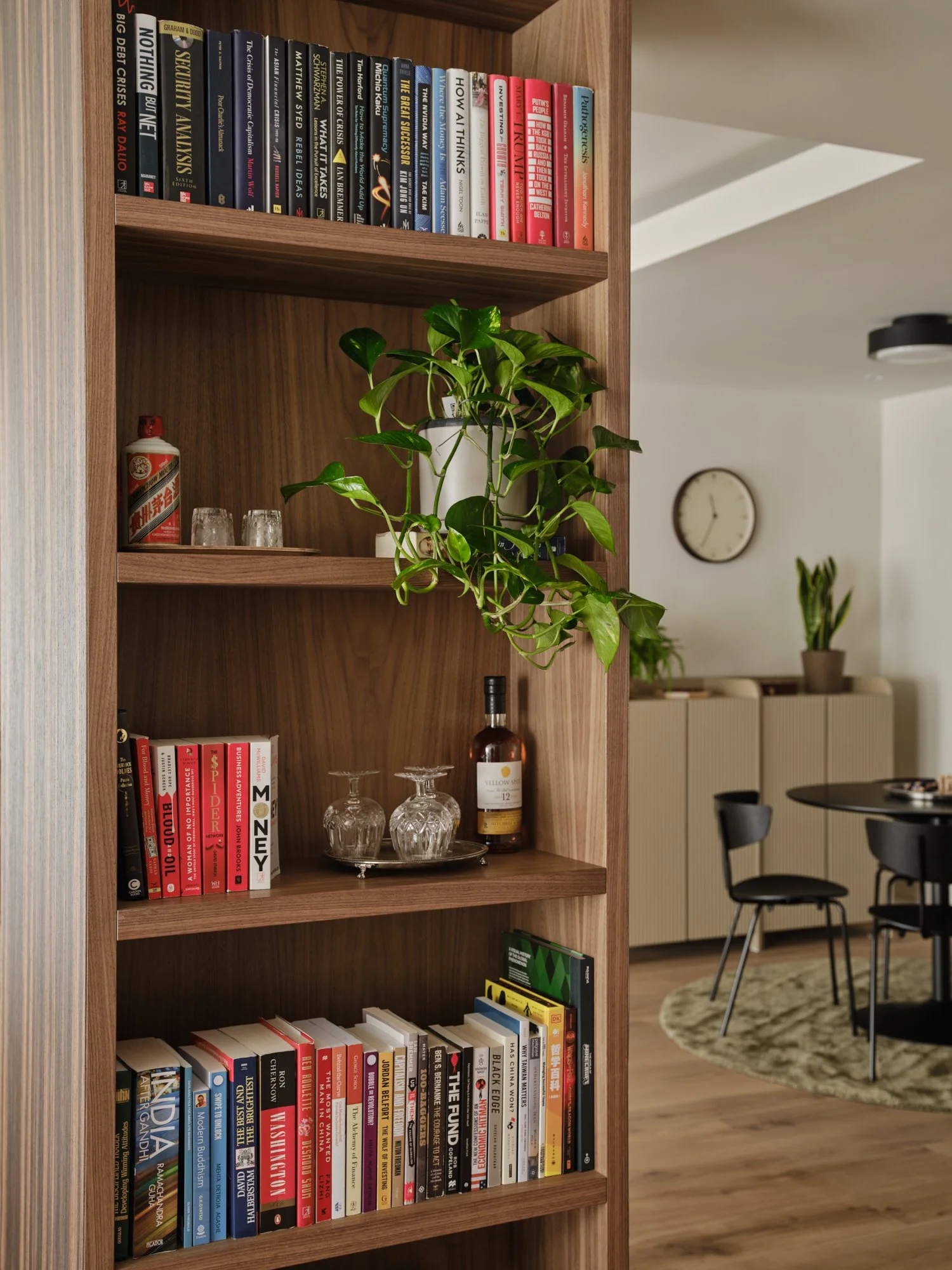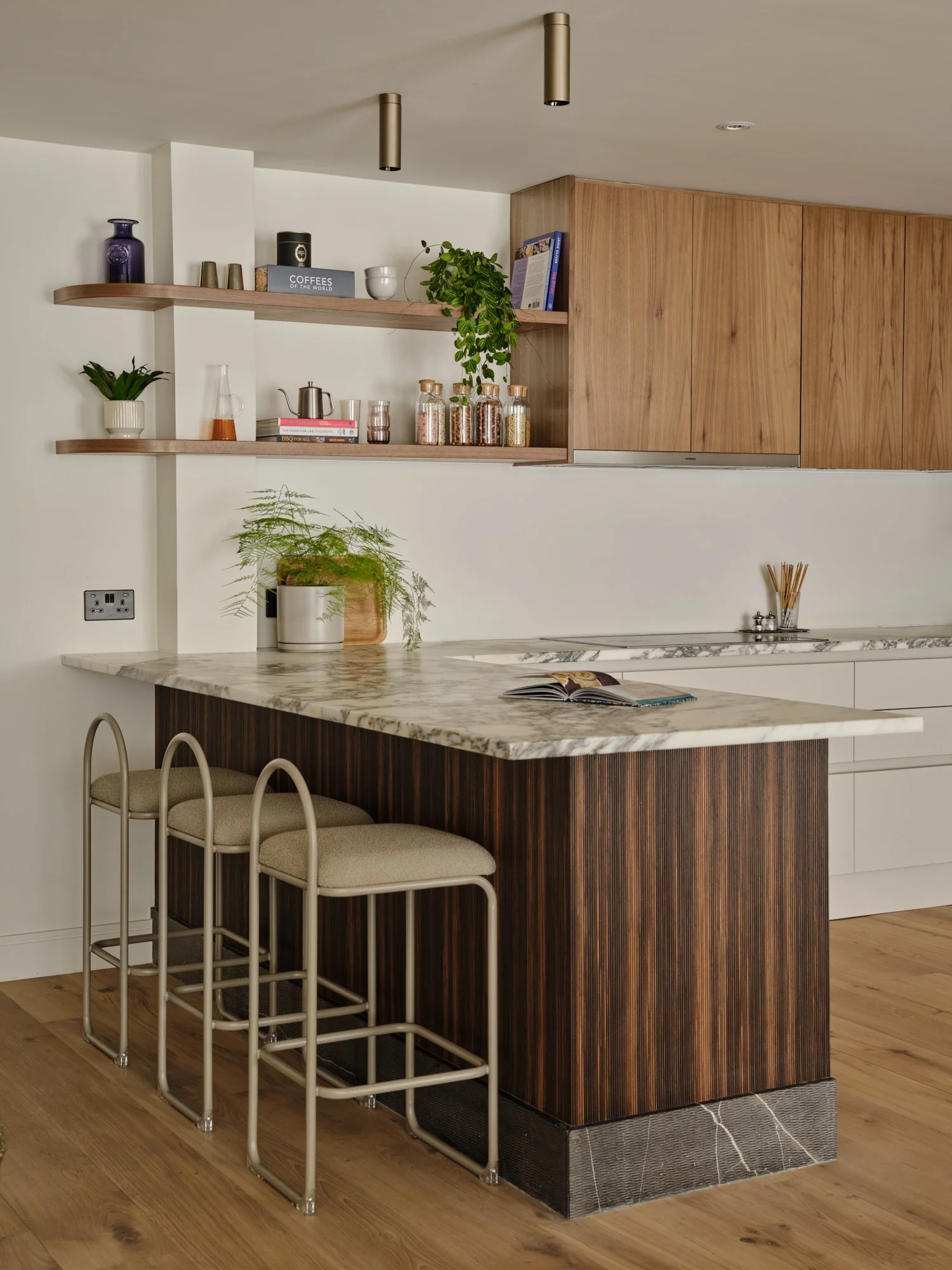 The back of the kitchen peninsula was wrapped in a striking ribbed ebony veneer, introducing texture and depth. The same material was used to clad another structural column, which was transformed into a bookshelf and bar unit, subtly dividing the kitchen, dining and lounge areas without interrupting flow.