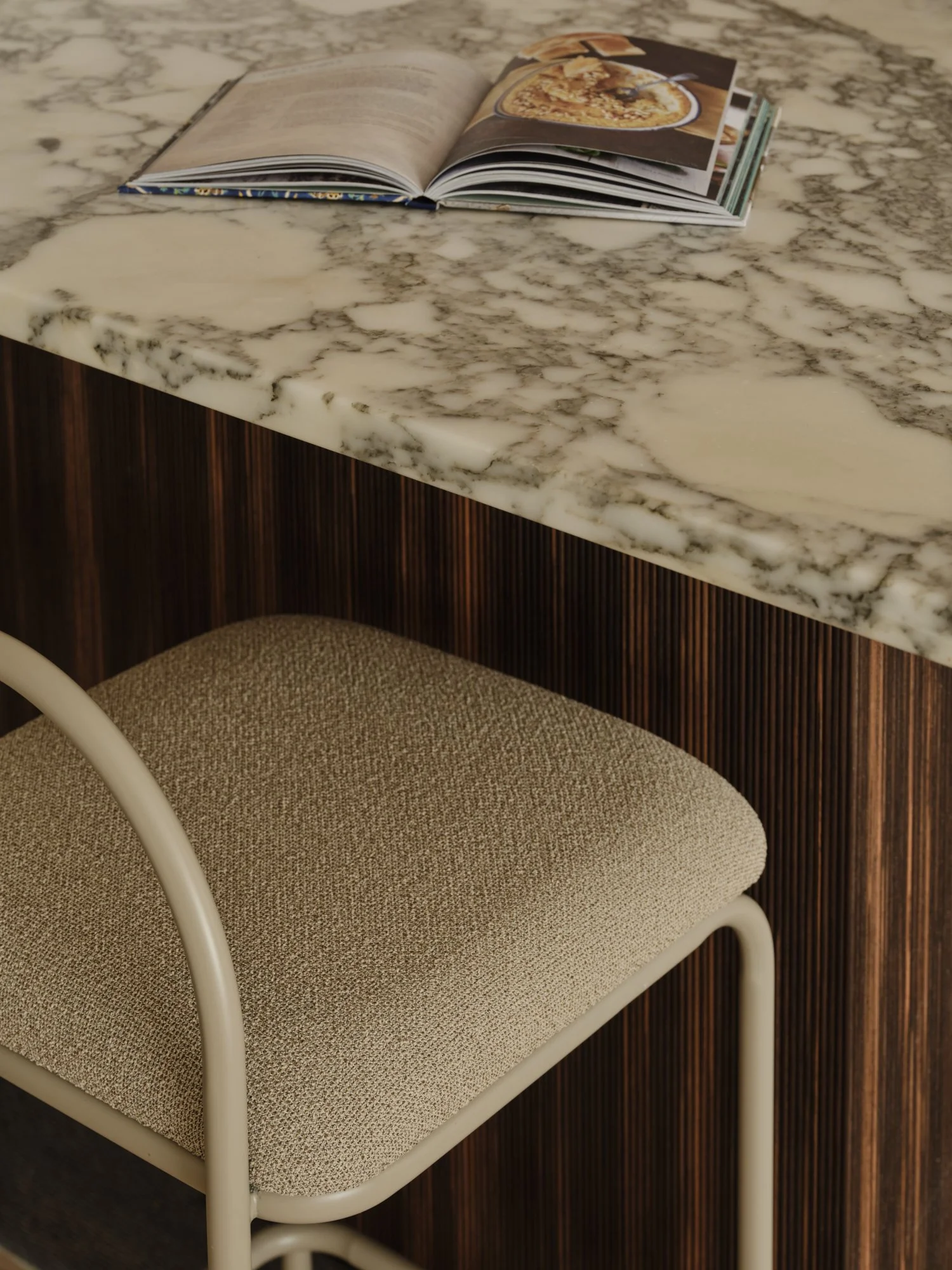 Given the scale of the splashback area, we opted for a minimal Corian backsplash that visually recedes into the background, allowing the marble worktops to take centre stage.