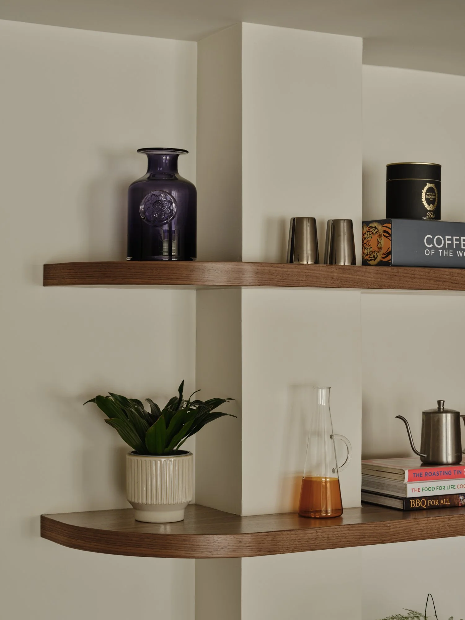 To balance the strong geometry of the space, some upper cabinets were replaced with open shelves, finished with a rounded edge to soften the overall look. These shelves wrap around a structural column, turning a constraint into a considered design feature.